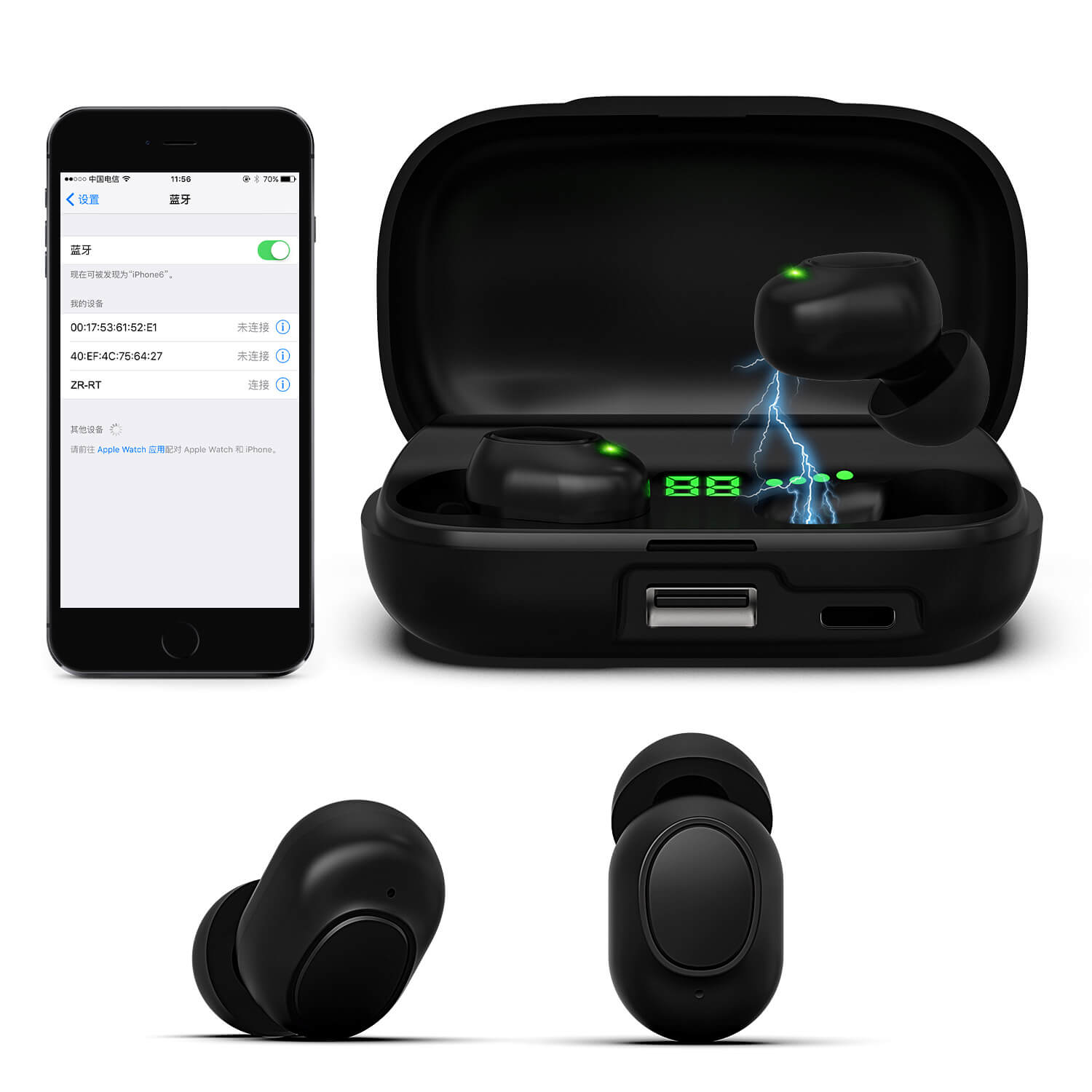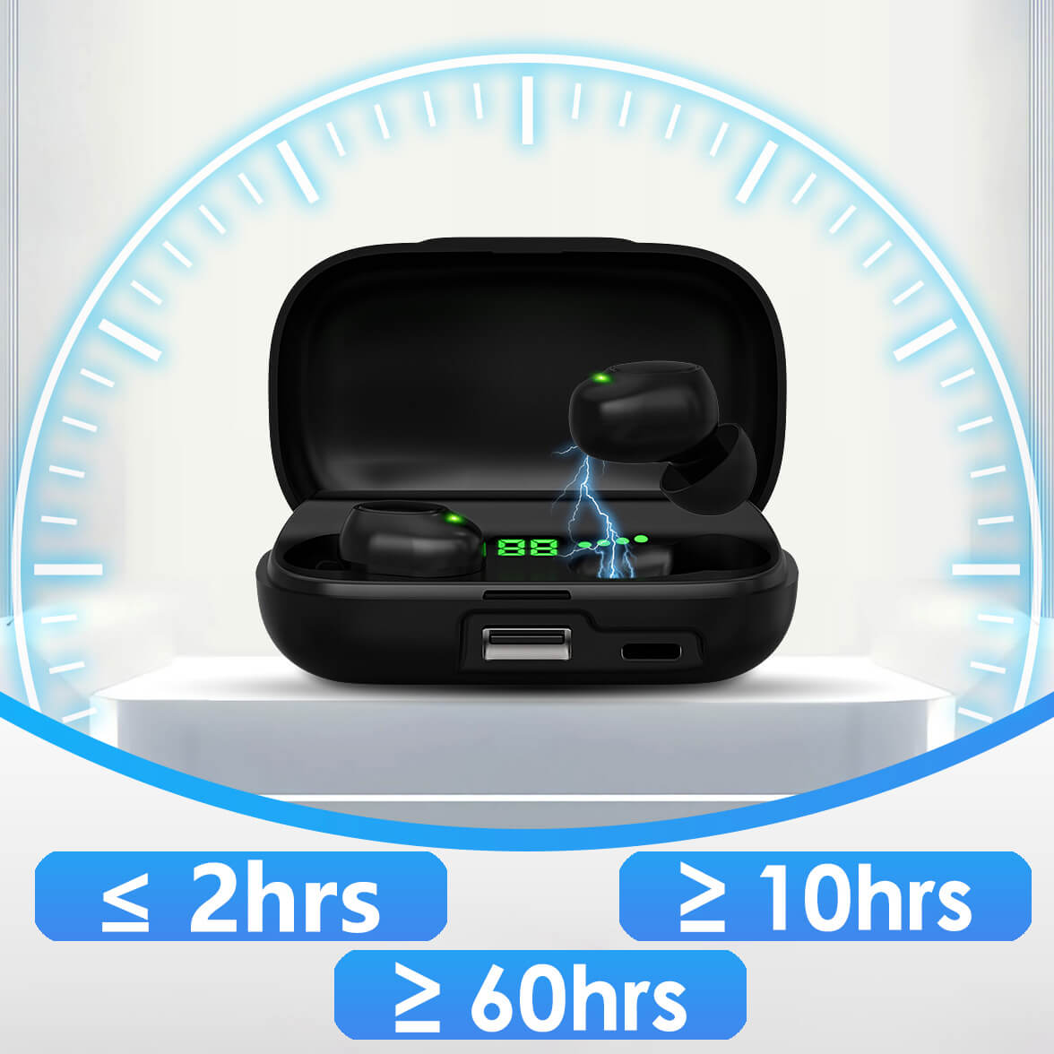 Take the earbuds out of the charging case. They will power on automatically after 6 seconds. (Default mode is Hearing Aid Mode.) Double-tap the volume button to switch to Bluetooth Mode.
